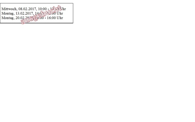 Donnerstag, 16.02.2017, 14:00 - 16:00 Uhr Mittwoch 22.02.2017, 14:00 - 16:00 Uhr Freitag, 01.03.2017, 10:00 - 12:00 Uhr