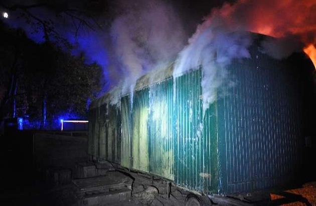 Am Mittwochabend, gegen 18.45 Uhr, wurden Feuerwehr und Polizei zu einem Brand auf einer Grünfläche am Burenkamp gerufen. Ein Zeuge hatte zuvor offene Flammen aus einem Bauwagen bemerkt und den Notruf gewählt. Beim Eintreffen der Einsatzkräfte standen zwei Bauwagen, die sich hinter einer Firma für Rücknahmeautomaten befinden, in Vollbrand. Die Berufsfeuerwehr Osnabrück löschte die Flammen rasch, konnte jedoch ein vollständiges Ausbrennen beider Bauwagen nicht verhindern. Personen wurden nicht verletzt. Nach derzeitigen Erkenntnissen ist von einer Brandstiftung auszugehen. Die Polizei hat die Ermittlungen aufgenommen und bittet Zeugen, die verdächtige Personen oder Fahrzeuge im Bereich des Burenkamps beobachtet haben, sich unter 0541/327-3103 oder -2115 zu melden.