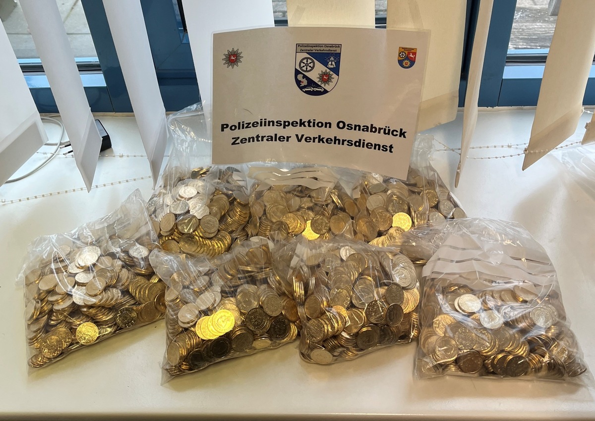 Am Dienstagvormittag (11.30 Uhr) kontrollierten Beamte des Zentralen Verkehrsdienstes der Polizei Osnabrück auf der A30 in Fahrtrichtung Hannover, in Höhe der Anschlussstelle Hasbergen, einen Kleinwagen mit niederländischer Zulassung. Im Verlauf der Kontrolle machten die Insassen teilweise widersprüchliche Angaben zu ihrem Reiseziel und Zweck der Fahrt. Bei der weiteren Überprüfung des Fahrzeugs fanden die Beamten unter dem Fahrer- sowie dem Beifahrersitz insgesamt drei Beutel mit Münzen. In den Beuteln befanden sich 3.400 Münzen zu je 20 dänischen Kronen. Der nominelle Gegenwert beläuft sich auf rund 9.100 Euro. Eine erste Überprüfung ergab, dass es sich bei den Münzen mutmaßlich um Fälschungen handelt. Das Bargeld wurde beschlagnahmt. Darüber hinaus stellten die Einsatzkräfte fest, dass für das Fahrzeug kein gültiger Versicherungsschutz bestand. Die Weiterfahrt wurde untersagt.