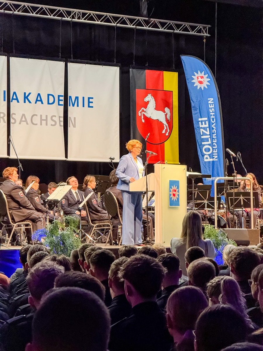 Die Niedersächsische Ministerin für Inneres, Sport und Digitalisierung, Daniela Behrens, sagte in ihrer Ansprache: "Mit Ihrem Diensteid bekennen Sie sich zu den Werten unseres Rechtsstaates. Niedersachsen braucht Menschen, die Verantwortung übernehmen und mit Professionalität und Menschlichkeit für Sicherheit sorgen. Die Polizeiakademie Niedersachsen ist ein Ort, an dem Sie das nötige Rüstzeug erhalten, das sie für die Erfüllung der bedeutsamen Aufgaben benötigen, die der Polizeiberuf für Sie bereithält. Ich wünsche Ihnen alles Gute für Ihr Studium."