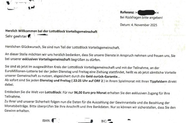 In den vergangenen Tagen meldeten sich mehrere Geschädigte bei der Poliizei , die unaufgefordert Post erhalten hatten, in der ihnen eine angebliche Mitgliedschaft in einer Vorteilsgemeinschaft bestätigt wurde. Zugleich wird in diesen Schreiben angekündigt, dass künftig monatliche Beiträge vom Konto der Betroffenen abgebucht würden.