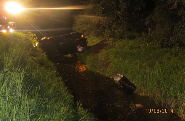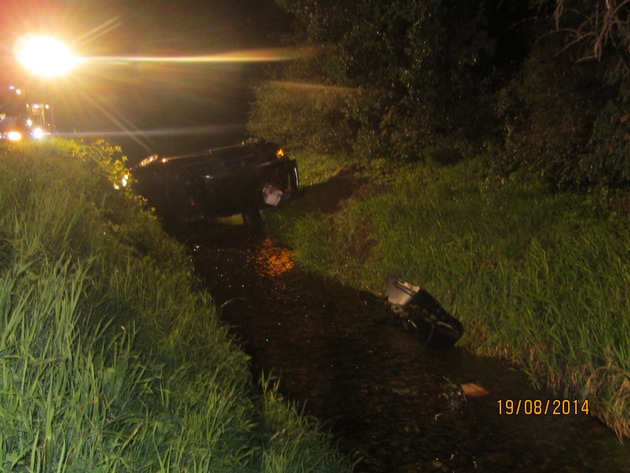 Am Dienstagabend, 19. August, gegen 23.00 Uhr kam der 18-jährige Fahrer eines Renault Megane auf der K 4941 mit Fahrtrichtung Heitersheim von der Straße ab. Bei dem Unfall hatte sich der Pkw mehrfach überschlagen und blieb im Sulzbach liegen. Beide Insassen konnten sich selbständig aus dem Fahrzeug befreien und hatten sich bei dem Unfall verletzt. Eine Person musste stationär in ein Krankenhaus aufgenommen werden. Der nicht mehr fahrbereite Unfallwagen musste mit einem Kranwagen aus dem Sulzbach geborgen werden. Laut Angaben des verunfallten Fahrzeuglenkers näherte sich von hinten rasant ein Pkw und scherte knapp vor dem Renault wieder ein. Der 18-Jährige lenkte daraufhin seinen Wagen nach rechts auf das Bankett und hatte dabei offensichtlich die Kontrolle über seinen Pkw verloren. Der rasant fahrende Pkw, zu dem es bislang keine Hinweise zum Typ oder zum Fahrer gibt, entfernte sich unerlaubt von der Unfallstelle. Die Polizei in Müllheim, Tel. 07631-17880, ermittelt und bittet um Hinweise zu dem am Unfall beteiligten Pkw.