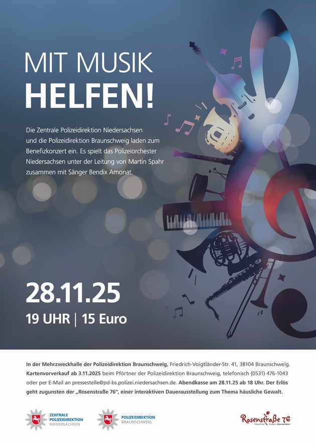 Braunschweig, 30.10.2025: Unter dem Motto "Mit Musik helfen" laden die Zentrale Polizeidirektion Niedersachsen und die Polizeidirektion Braunschweig auch in diesem Jahr wieder zum traditionellen Benefizkonzert des Polizeiorchesters Niedersachsen ein. Das Konzert findet am 28. November 2025 um 19 Uhr in der Mehrzweckhalle der Polizeidirektion Braunschweig, Friedrich-Voigtländer-Straße 41, statt.