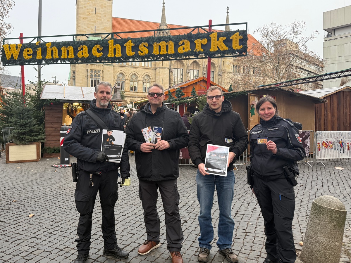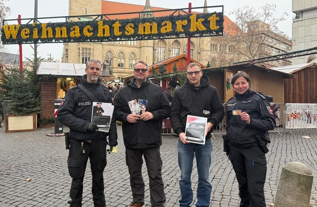 Alle Jahre wieder kommt es in der Weihnachtszeit, insbesondere rund um den Weihnachtsmarkt, zu Taschendiebstählen. Auch wenn die Polizei Braunschweig in den vergangenen Jahren nur wenige Taten auf dem Weihnachtsmarkt zu verzeichnen hatte, bleibt die Problematik im Weihnachtstrubel bestehen. Auch im Gedränge der Einkaufshäuser oder an Bus- und Bahnhaltestellen, beispielsweise auf dem Nachhauseweg von der Weihnachtsfeier, schlagen die Täter zu. Damit es erst gar nicht zum Taschendiebstahl kommt, waren Heinz-Werner Laue, Julia Mispelhorn und Johannes Schrödl, Sachbearbeiter im Präventionsteam der Polizeiinspektion Braunschweig, am Donnerstag auf dem Braunschweiger Weihnachtsmarkt unterwegs, um Plakate zu verteilen. Hierbei kamen sie mit den Standbetreibern und den Bürgerinnen und Bürgern ins Gespräch. Die Plakate sollen dabei helfen, das Bewusstsein der Bürgerinnen und Bürgern zu stärken und sie stetig daran zu erinnern auf ihre Wertsachen Acht zu geben.