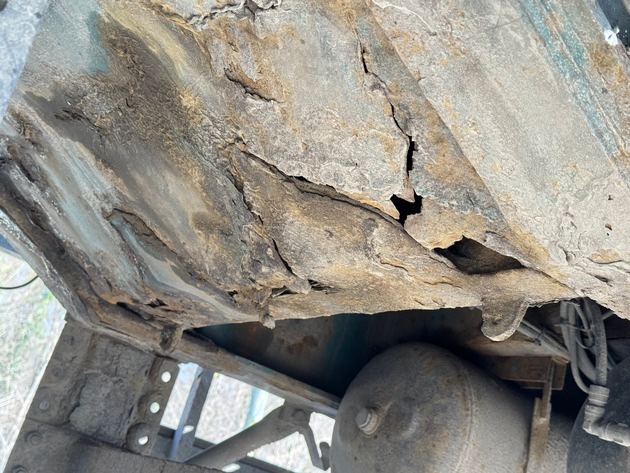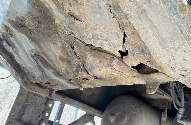 Einen besonders erschreckenden Zustand wies ein litauischer Sattelzug auf. Der Sattelauflieger aus dem Baujahr 1995 war an den tragenden Stellen derart rostbefallen, dass das Material mit bloßen Händen auf- bzw. abgebrochen werden konnte (Foto). Der Fahrzeugzustand wurde bei einer Prüfstelle von einem Sachverständigen als gefährlich eingestuft. Die Weiterfahrt mit dem Auflieger wurde anschließend nach mehr als einer Millionen Kilometern untersagt. Hier hing es mitunter vom Zufall ab, dass durch den verkehrsunsicheren Zustand keine schwerwiegenden Folgen entstanden sind.