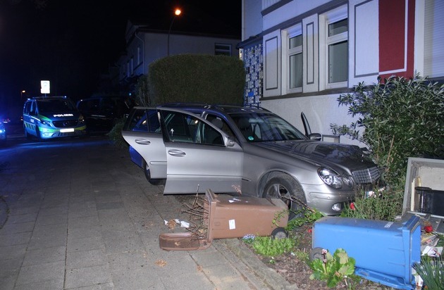 Als der unbekannte Fahrer dies bemerkte, beschleunigte er das Auto und versuchte vor der Kontrolle zu flüchten. Die Polizisten schalteten das Blaulicht und Einsatzhorn des Streifenwagens ein und gaben dem Fahrer Anhaltesignale. Dieser ignorierte weiterhin die Aufforderung anzuhalten und setzte seine Flucht über die Achternbergstraße in Richtung Essen fort. Auf Essener Stadtgebiet missachtete der Flüchtende an zwei Kreuzungen das Rotlicht der dortigen Ampeln und fuhr weiter mit deutlich überhöhter Geschwindigkeit. In der Meerbeckshofstraße kam der Mercedes von der Fahrbahn ab, kollidierte mit einer Mülltonnenbox und kam in einem Vorgarten zum Stehen.