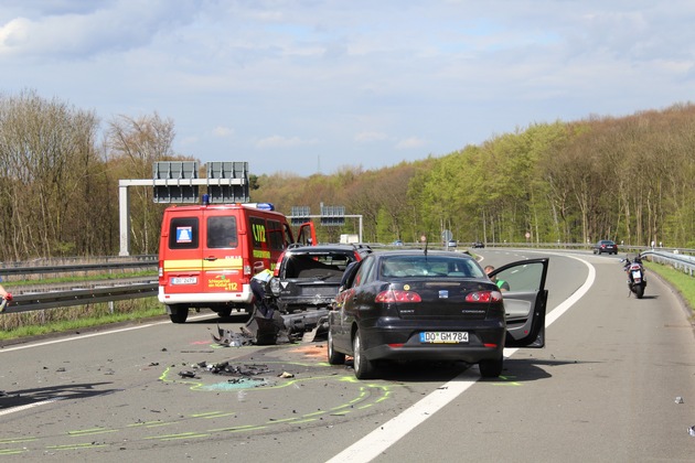 Auf der B 54 in Fahrtrichtung Stadtmitte, Höhe der Autobahn A 45 verunglückte ein männlicher Motorradfahrer gegen 14:20 Uhr aus bisher unbekannter Ursache und zog sich dabei schwere Verletzungen zu. Im weiteren Verlauf unmittelbar danach kam es zu einem Verkehrsunfall zwischen zwei PKW.