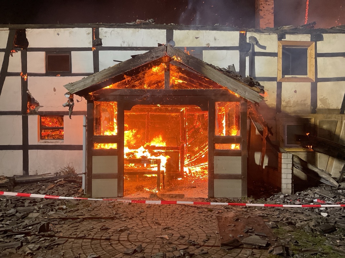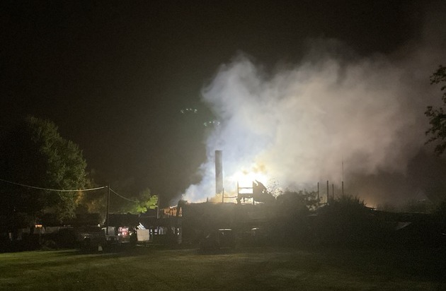 Um 03:56 Uhr erreichte die Leitstelle der Feuerwehr ein erneuter Notruf, aus bisher ungeklärter Ursache war es erneut zu einem Brandereignis gekommen. Bei Eintreffen der ersten Einsatzkräfte stand das Erdgeschoss des Gebäudes bereits in Vollbrand. Trotz sofort eingeleiteter Löschmaßnahmen mit einem erhöhten Kräfteansatz, sind weite Teile des Gebäudes bis auf die Grundmauern niedergebrannt. Ein Übergreifen auf ein sich in unmittelbarer Nähe befindliches Mobilwohnheim konnte erfolgreich verhindert werden. Die Nachbargebäude und die umliegende Vegetation konnten ebenfalls vor den Flammen geschützt werden.