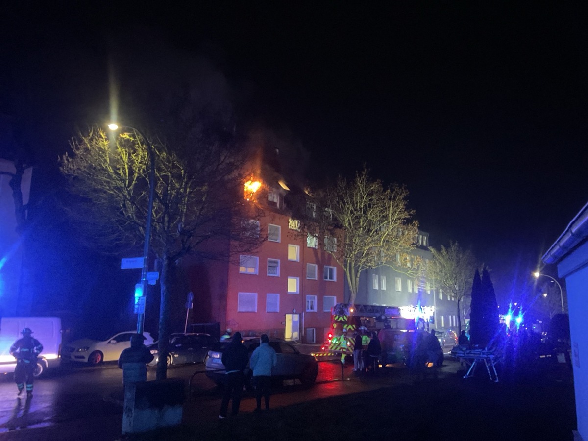 Die Feuerwehr Dortmund wurde am späten Abend gegen 23:16 Uhr zu einer unklaren Feuermeldung in die Huckarder Allee alarmiert. Erste Anrufer meldeten eine deutliche Rauchentwicklung aus einem Mehrfamilienhaus. Beim Eintreffen der ersten Einheiten der Feuerwehr befanden sich bereits polizeiliche Kräfte vor Ort. Im Obergeschoss des Gebäudes war ein Fenster geborsten, aus der betroffenen Wohnung schlugen bereits Flammen. Zu diesem Zeitpunkt war unklar, ob sich noch Personen in der Brandwohnung befanden.