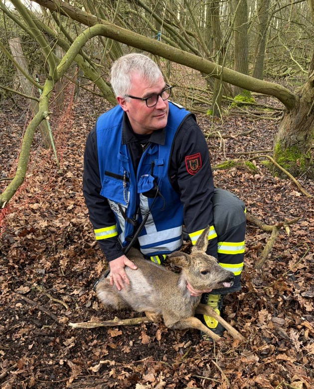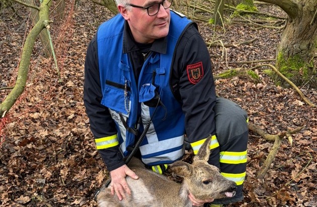 Vor Ort stellten die Feuerwehrleute fest, dass sich ein sehr junges Reh mit dem Kopf im Zaun verfangen hatte und nicht mehr in der Lage war, seinen Kopf aus dem Zaun heraus zu ziehen. Die Kollegen nahmen das Tier behutsam auf den Arm und schnitten die Maschen um den Kopf des Rehes auf, um das Tier schonend zu befreien.