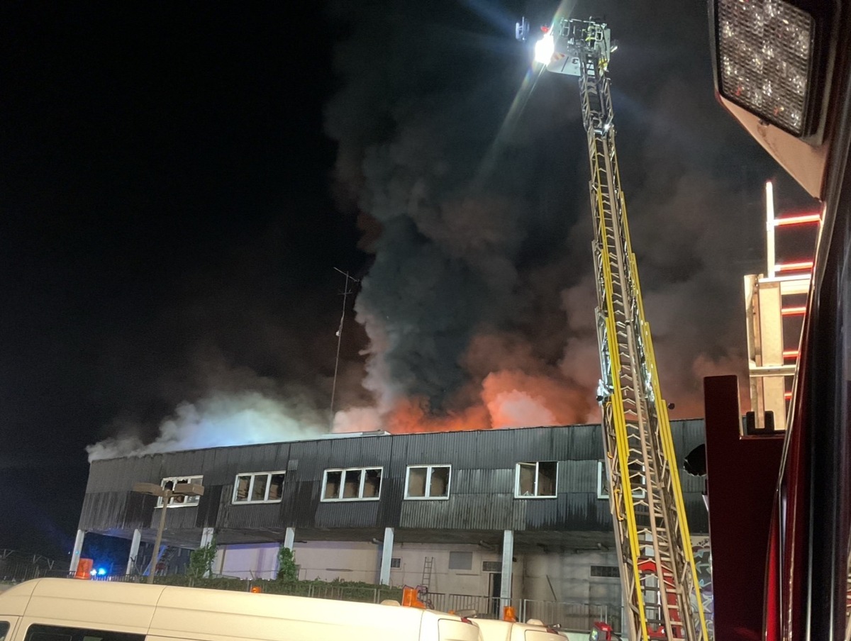 Die Feuerwehr Dortmund wurde am gestrigen Abend gegen 21:30 Uhr in die südliche Innenstadt alarmiert. An der Ernst-Mehlich-Straße wurde ein Feuer in einem leerstehenden, zum Teil baufälligen, Gebäude gemeldet. Zunächst wurde versucht, den Brand im Inneren des Gebäudes zu bekämpfen. Da sich keine Person mehr innerhalb ausgehalten haben, konnten sich die Einsatzkräfte rein auf die Brandbekämpfung konzentrieren. Das Feuer hatte sich rasch auf das gesamte Gebäude ausgebreitet, so dass die Stabilität des Daches nicht mehr gewährleistet war. Somit zogen sich die Brandschützer aus dem Gebäude zurück und konzentrierten sich auf das Löschen des Feuers von außen. Dabei galt es, umstehende Gebäude zu schützen. Dafür wurde Wasser unter anderem über zwei Drehleitern und den Teleskopmast abgegeben. Durch die große Rauchentwicklung kam es im gesamten Innenstadtbereich zu einer starken Geruchsbelästigung und führte zu weiteren Anrufen in der Einsatzleitstelle der Feuerwehr. Eine Meldung über die Warn-Apps NINA und KATWARN, appellierte, die Bürger*innen der Stadt, Fenster und Türen geschlossen zu halten. Trotz der massiven Löschmaßnahmen breitete sich das Feuer im Dachbereich weiter aus und führte letztendlich zum Teileinsturz des Daches. Über die Drehleitern wurde auch Schaummittel zur Brandbekämpfung eingesetzt. Vor Ort waren mehrere Löschzüge der Berufsfeuerwehr, sowie der Freiwilligen Feuerwehr, Spezialeinheiten und der Rettungsdienst mit mehr als 100 Einsatzkräften Durch den anhaltenden Einsatz wurden Wachen der Berufsfeuerwehr durch Löschzüge der Freiwilligen Feuerwehr besetzt, damit eine Grundsicherung der Stadt sichergestellt werden konnte. Auch dienstfreies Personal der Berufsfeuerwehr wurde alarmiert. Bei den Löscharbeiten wurde ein Feuerwehrmann leicht verletzt und zur weiteren Kontrolle in ein Krankenhaus transportiert. Die Brandursache wird im Anschluss der Maßnahmen von der Polizei untersucht. In den frühen Morgenstunden hatte die Feuerwehr das Feuer unter Kontrolle, die Einsatzdauer ist derzeit noch nicht absehbar.