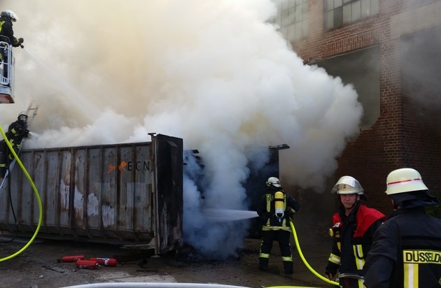 Auf dem Industrieterrain finden zurzeit umfangreiche Abrissarbeiten statt. Dabei sammeln die Bauarbeiter das Altholz in großen 36-Kubikmeter-Containern für eine fachgerechte Entsorgung. Aus ungeklärter Ursache geriet ein Container in Brand. Beim Eintreffen des Löschzuges brannte der Inhalt des Altholzcontainers bereits mit hellen Flammen. "Der Container war mit rund 800 Grad so heiß, dass ein großer Teil des Löschwassers sofort wieder verdampfte. Über 15.000 Liter Löschwasser waren notwendig, um den Flammen Herr zu werden", berichtet Einsatzleiter Oliver Schulz von der Wache in Oberkassel. Die Löscharbeiten unterstütze ein großer Abrissbagger, der das Altholz aus dem Container herausholte. Auf dem Freigelände abgelegt, konnten die Wehrleute mit drei Strahlrohren die Flammen und Glutnester erfolgreich löschen. Nach knapp zwei Stunden rückten die Einsatzfahrzeuge wieder ab.