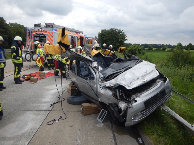 Noch während der technischen Rettungsmaßnahmen wurde der Patient durch die Notärztin der Berufsfeuerwehr in seinem PKW erst versorgt. Aufgrund der Schwere und Art der Verletzungen musste der Patient in eine Spezialklinik eingeliefert werden. Für den Transport wurde der Rettungshubschrauber aus Duisburg angefordert, der den Patienten innerhalb von 10 min in die Spezialklinik transportierte. Eine Unfallzeugin war durch das Ereignis so geschockt, das sie zur Abklärung einem Arzt vorgestellt werden musste.