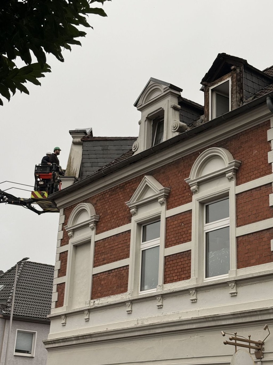 Am Mittwochmorgen gegen 8:00 Uhr wurde die Feuerwehr Mülheim an der Ruhr zu einem Einsatz in die Trooststraße gerufen. An einem Wohngebäude in Höhe der Kampstraße waren Fassadenteile im Bereich einer Dachgaube herabgestürzt. Die Trümmerteile fielen auf die Fahrbahn und beschädigten dabei zwei geparkte Fahrzeuge.