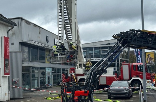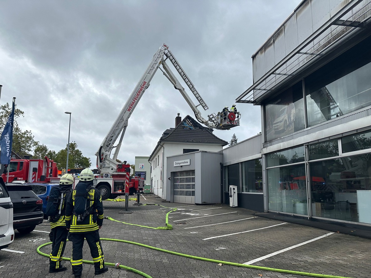 Die Nachlöscharbeiten an der Kölner Straße dauern weiterhin an. Nachdem das Feuer in einer Autowerkstatt mit angeschlossenem Autohaus am Vormittag vollständig unter Kontrolle gebracht werden konnte, konzentrieren sich die Einsatzkräfte derzeit auf das Ablöschen verbliebener Glutnester.