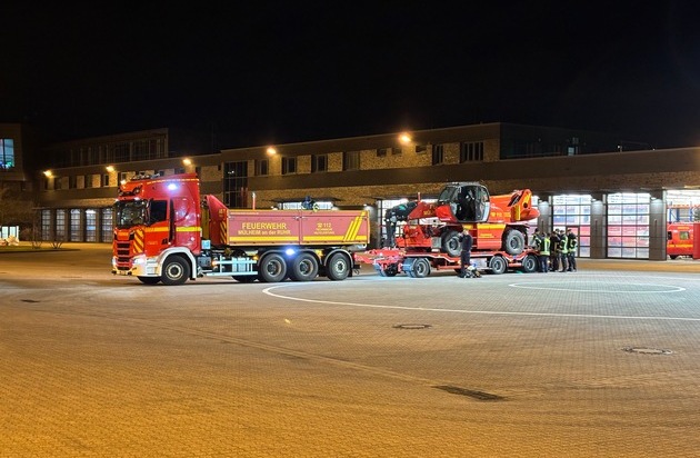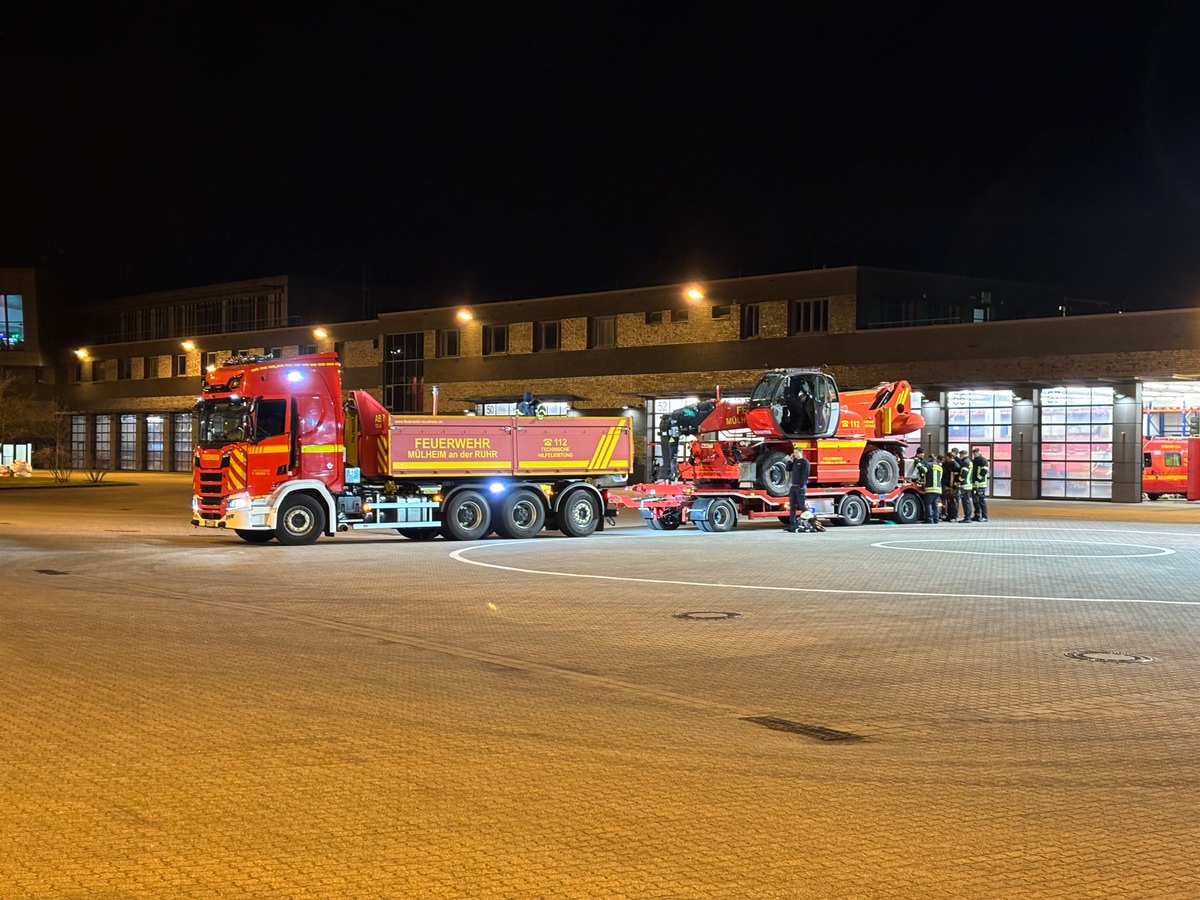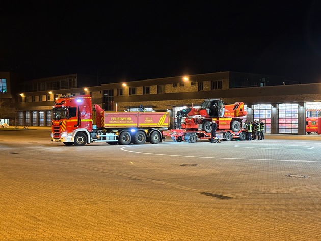 In der Nacht vom 10.03.26 auf den 11.03.26 wurde durch die BF Oberhausen der Teleskoplader zu einem Brand angefordert. Durch die Leitstelle wurde ein Führungsdienst zur Erkundung zur Einsatzstelle in einem Gewerbegebiet entsendet. Zeitgleich wurde der Teleskoplader zum Transport auf einem speziellen Anhänger vorbereitet.