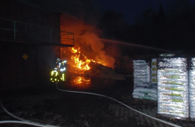 Um 16:29 Uhr ging der Notruf bei der Leitstelle der Feuerwehr Bottrop ein. Gemeldet wurde ein Brand in einer Lagerhalle am Nordring. Der Löschzug der Berufsfeuerwehr rückte zusammen mit den Ortswehren Eigen und Fuhlenbrock aus. Bei Eintreffen an der Einsatzstelle brannte die Halle in voller Ausdehnung. Es brannten gestapelte Quader mit Kleintierstreu sowie Kaminholz in einer Abmessung von ca. 12m x 7m. Der Brand hatte bereits auf zwei in der Nähe stehende Container übergegriffen. Durch eine Riegelstellung konnte eine weitere Ausbreitung auf einen benachbarten Container mit Düngemitteln verhindert werden. Zur Brandbekämpfung wurden ein B-Rohr und 3 C-Rohre im Außenangriff eingesetzt. Für die Nachlöscharbeiten wurde ein Radlader des THW angefordert. Dieser zog das Brandgut aus der Halle, wo es dann abgelöscht wurde. Die Nachlöscharbeiten dauerten bis 23.00 Uhr an. Die Ortswehren Altstadt und Grafenwald stellten während der Löscharbeiten mit 30 Kräften den Grundschutz für das Stadtgebiet sicher. An der Einsatzstelle waren 45 Einsatzkräfte zur Brandbekämpfung im Einsatz. Des Weiteren wurde die Leitstelle mit Freizeitkräften verstärkt. Die Polizei hat die Ermittlungen zur Brandursache aufgenommen.