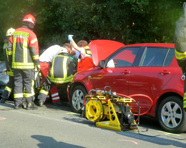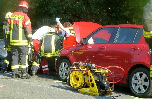 "Die Zusammenarbeit von Notarzt, Rettungsdienst und Feuerwehr ist an solchen Einsatzstellen lebenswichtig", erläutert Einsatzleiter Jan Heinisch. "Die Feuerwehr stellt die technischen Geräte bereit und der Notarzt bestimmt, wie der Patient möglichst schonend aus dem Fahrzeug befreit wird." Während der Fahrer des Geländewagens sowie die beiden Insassen des dritten PKW mit leichten Verletzungen in das nahe gelegene Klinikum gefahren wurden, erlitt die Kleinwagen-Fahrerin schwere Verletzungen. Sie musste, nachdem die Feuerwehr die Patientin aus dem PKW befreit hatte, mit einem Hubschrauber und einem Verdacht auf Trümmerbruch in die Uniklinik Essen geflogen werden.