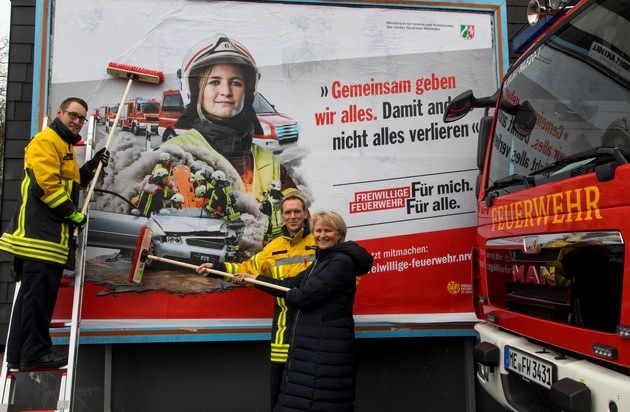 Am Freitag, den 3. Februar 2017 starteten Vertreter des NRW-Innenministeriums und des nordrhein-westfälischen Feuerwehrverbandes eine landesweite Kampagne zur Nachwuchsgewinnung in den Freiwilligen Feuerwehren. "Gemeinsam geben wir alles. Damit andere nicht alles verlieren" ist in großen Lettern zu lesen, darunter "FREIWILLIGE FEUERWEHR. Für mich. Für alle." Eine solch groß angelegte Kampagne für das Feuerwehr-Ehrenamt hat es bis dato in NRW noch nie gegeben.