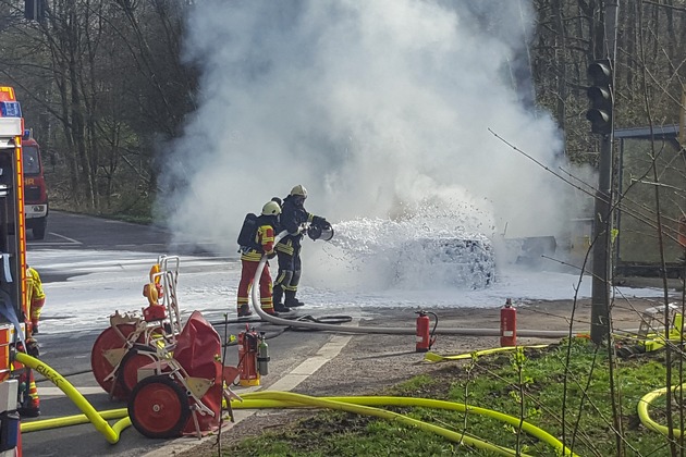 Um 16:25 Uhr riefen die Funkmeldeempfänger die diensthabende Löschgruppe der Feuerwehr aus der Freizeit, das Einsatzstichwort lautete "Fahrzeugbrand". Mit zwei Löschfahrzeugen rückten die Einsatzkräfte an die Bushaltestelle "Bahnhof Isenbügel" an der Ruhrstraße aus. Beim Eintreffen der Brandschützer stand das Fahrzeug komplett in Flammen, brennendes Benzin lief aus dem Fahrzeug aus. "Den Brand löschten wir mit Schaum, ebenso haben wir die Straße mit Schaum abgedeckt, um die Brandgefahr durch das Benzin zu beseitigen.", schildert der stv. Leiter der Feuerwehr, Nils Vollmar, den Einsatz. "Personen kamen nicht zu Schaden, aber das Fahrzeug war nicht mehr zu retten."