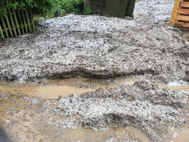 "Wir haben die Kräfte auf die Einsatzstellen aufgeteilt", erklärt der stellvertretende Wehrleiter Nils Vollmar. Vollmar selbst fuhr mit einem Teil der Mannschaft zum Angerweg. Zunächst sah es aus, als wäre großflächig Kies auf dem Hof verteilt worden. "So etwas habe ich noch nicht gesehen", schildert Vollmar. "Wir haben hier mit viel Wasser gerechnet, aber nicht mit Schlamm und Hagel." Der kurzzeitige, starke Hagelfall löste Teile des oberhalb liegenden Feldes und spülte diese bergab. Große Flächen des Hofes waren mit Schlamm bedeckt, viele Teile zudem ca. 30 cm hoch mit Hagelkörnern. Eine Kellergarage war über einen Meter hoch mit Hagel gefüllt. Vollmar selbst versank bis zum Oberschenkel in einer Masse aus Schlamm, Hagelkörnern und Wasser, als er einen Schritt zuviel in die falsche Richtung wagte. "Gehört dazu", schmunzelt er.