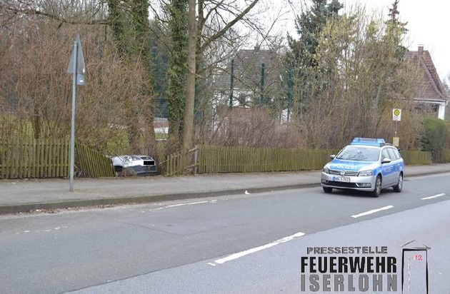 Um 10:20 Uhr wurde der Einsatzzentrale der Feuerwehr Iserlohn ein Verkehrsunfall mit einer eingeklemmten Person im Ortsteil Sümmern gemeldet. Auf der Straße "Burggräfte" war ein Fahrzeug aus unbekannten Gründen von der Fahrbahn abgekommen. Entgegen der ersten Meldungen war die Person nicht eingeklemmt und hatte bereits vor dem Eintreffen der Feuerwehr das Fahrzeug verlassen. Die leicht verletzte Person wurde vom Rettungsdienst übernommen und in ein Iserlohner Krankenhaus transportiert.