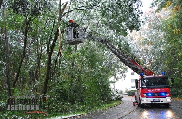 Die Einsatzkräfte der Iserlohner mussten heute schon mehrfach zu abgebrochenen Ästen und umgestürzten Bäumen ins Stadtgebiet ausrücken. Bedingt durch den nassen Schnee besteht eine erhöhte Gefahr von Astbrüchen. Die belaubten Äste sind vielfach nicht in der Lage die zusätzliche Last zu tragen. Wir raten daher zu erhöhter Vorsicht beim Betreten des Waldes und beim Aufenthalten unter Bäumen.