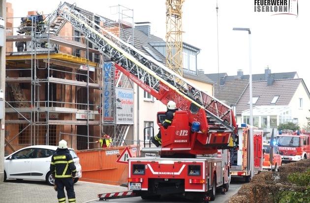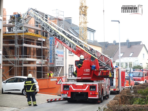 Auf einer Baustelle an der Arndtstraße ereignete sich gegen kurz vor 10:00 Uhr ein medizinischer Notfall. Nach notärztlicher Versorgung musste der Patient schonend vom Obergeschoss des Rohbaus zum bereitstehenden Rettungswagen transportiert werden. Hierfür kam die Drehleiter der Berufsfeuerwehr Iserlohn mit der Krankentragenlagerung zum Einsatz. Unterstützung erhielten die Einsatzkräfte von der Besatzung des Löschgruppenfahrzeugs der Löschgruppe Letmathe. Die ehrenamtlichen Kräfte der Freiwilligen Feuerwehr waren alarmiert worden, da sich die Berufsfeuerwehr noch im Einsatz beim Verkehrsunfall in der Läger befand.