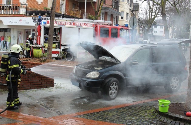 Zu einem PKW-Brand an der Hagener Straße rückte am heutigen Karfreitag die Berufsfeuerwehr Iserlohn gegen 13:00 Uhr aus. Vor dem Eintreffen der Feuerwehr hatten bereits der Besitzer des Fahrzeugs und Polizeibeamte mit je einem Feuerlöscher die Flammen im Motorraum abgelöscht. Mit einem C-Rohr wurden Glutnester in den Verkleidungen und den Dämmmaterialien des Fahrzeugs von den Einsatzkräften gelöscht. Anschließend erfolgte eine Kontrolle mit der Wärmebildkamera. Personen kamen nicht zu Schaden.