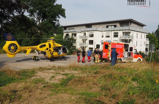 Zu einem häuslichen Unfall an der Lange Straße rückte der Rettungsdienst der Berufsfeuerwehr Iserlohn heute Nachmittag um 17:00 Uhr aus. Aufgrund der Schwere der Verletzung wurde zum Transport in eine Bochumer Klinik der Rettungshubschrauber (RTH) Christoph 8 alarmiert. Der RTH landete im Bereich der Gartenstraße. Die Besatzungen des Hilfeleistungslöschfahrzeugs und des Einsatzleitwagens der Berufsfeuerwehr Iserlohn sicherten den Landeplatz ab und unterstützten die Rettungsdienstbesatzungen.