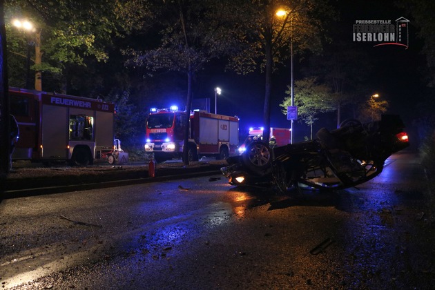 Um 22:35 Uhr wurde der Einsatzzentrale der Berufsfeuerwehr Iserlohn ein Verkehrsunfall auf der Dortmunder Straße in Fahrtrichtung Schwerte, zwischen der Karl Arnold Straße und der Friedhofstraße, gemeldet. Aus ungeklärter Ursache überschlug sich ein BMW und blieb auf dem Dach liegen. Die beiden Insassen konnten von Passanten vor Eintreffen der Feuerwehr aus dem Fahrzeug befreit werden. Beide Personen wurden mit schweren Verletzungen vom Rettungsdienst in Iserlohner Krankenhäuser transportiert. Da die Fahrbahnen der Dortmunder Straße in beiden Fahrtrichtungen von Trümmerteilen und Betriebsstoffen verunreinigt waren, wurden zwei Spezialunternehmen zur Reinigung der Fahrbahnen verständigt. Die Beamten der Berufsfeuerwehr unterstützten den Rettungsdienst, sicherten den Brandschutz und leuchteten die Einsatzstelle für die Unfallaufnahme der Polizei aus. Die Dortmunder Straße war in diesem Abschnitt für rund zwei Stunden voll gesperrt.