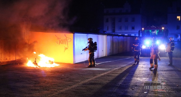 Mehrere Notrufe meldeten am Sonntagabend gegen 22:20 Uhr Feuerschein in einem Garagenhof an der Duesbergstraße. Sie vermuteten einen Garagenbrand. Bei Eintreffen des Löschzugs der Berufsfeuerwehr brannte im Garagenhof ein Motorroller in voller Ausdehnung. Das Feuer wurde mit einem C-Rohr unter Atemschutz gelöscht. Die Garagen wurden nicht beschädigt. Die mitalarmierte Löschgruppe Stadtmitte der Freiwilligen Feuerwehr konnte den Einsatz abbrechen. Die Ermittlung zur Brandursache und der Schadenshöhe hat die Polizei übernommen. Personen kamen nicht zu Schaden.