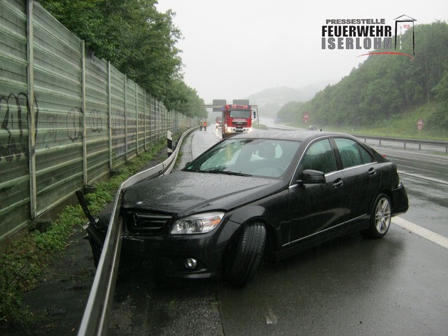 Auf der Autobahn 46 kam es während des starken Regens zu einem Alleinunfall eines Fahrzeugs. In Höhe der Anschlussstelle Oestrich, in Fahrtrichtung Hemer, hatte sich ein Mercedes gedreht und schlug mit Heck und Front gegen die Leitplanken, bevor er auf der Standspur in der Leitplanke zum Stehen kam. Der Fahrer wurde durch den Rettungsdienst untersucht. Ein Transport in ein Krankenhaus war hier nicht erforderlich. Die Kräfte der Berufsfeuerwehr sicherten die Unfallstelle ab. Weitere Maßnahmen waren nicht erforderlich.