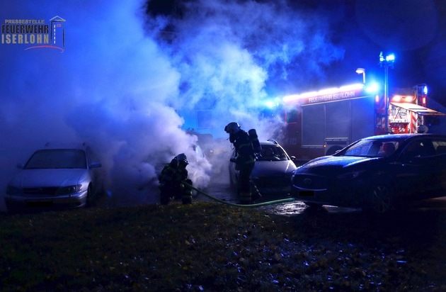 Am frühen Samstagmorgen um 05:42 Uhr wurde die Feuerwehr Iserlohn zu einem Fahrzeugbrand am Föhrenweg im Ortsteil Nußberg gerufen. Bei Eintreffen der Berufsfeuerwehr brannte ein geparkter Seat im Motorraum in voller Ausdehnung. Mit einem C-Rohr unter Atemschutz konnten die Einsatzkräfte ein Übergreifen auf daneben geparkte Fahrzeuge verhindern und das Feuer löschen. Mindestens ein geparktes Fahrzeug wurde durch die Wärmestrahlung aber trotzdem nicht unerheblich beschädigt. Die Schadenshöhe und die Brandursache werden durch die Polizei ermittelt. Personen kamen nicht zu Schaden.