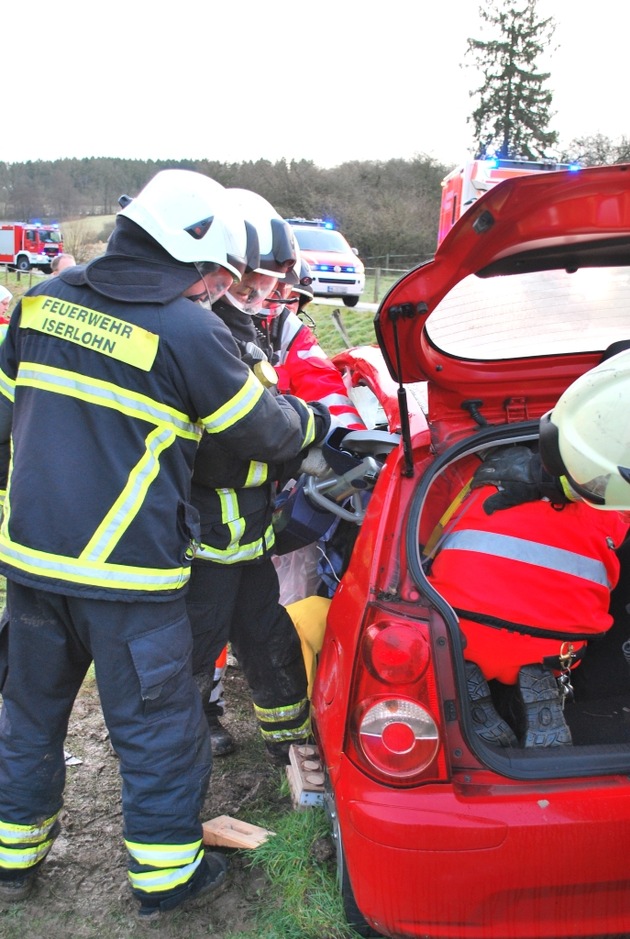 Nach Dahlsen musste die Feuerwehr Iserlohn heute Morgen gegen 8:30 Uhr ausrücken. Auf der dort verlaufenden Grüner Talstraße hatte eine Autofahrerin die Kontrolle über ihren PKW verloren, war von der Fahrbahn abgekommen und hatte sich überschlagen. Sie blieb mit ihrem Fahrzeug auf einem Feld liegen und verletzte sich bei dem Unfall schwer. Die Verletzte wurde noch in ihrem Auto vom Rettungsdienst erstversorgt und anschließend schonend gerettet. Hierzu setzte die Feuerwehr hydraulische Rettungsgeräte ein und entfernte das Dach des Unfallwagens. Den anschließenden Transport in ein Unfallkrankenhaus nach Dortmund übernahm der ebenfalls alarmierte Rettungshubschrauber Christoph 8.