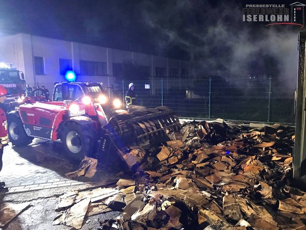 Berufsfeuerwehr und Löschgruppe Stadtmitte mussten in der Nacht einen arbeitsintensiven Containerbrand bekämpfen. Gegen 23:00 Uhr erfolgte der Alarm zu einem Einsatz, der sich über gut vier Stunden hinziehen sollte. Der Inhalt einer Kartonagenpresse war auf einem Hinterhof in der Arnsberger Straße in Brand geraten. Da der Container nahe an einem Wohn- und Geschäftshaus stand, wurde dieser zunächst mit einem Wechelladerfahrzeug umgesetzt. Nach dem der Container geöffnet wurde, musste der Inhalt vollständig ausgeräumt und abgelöscht werden. Mit zwei C- Rohren und unter Atemschutz war dies eine kräftezehrende Aufgabe, die im weiteren Verlauf durch den Einsatz des Multifunktionsgerätes "Manitou" unterstützt wurde. Während des Einsatzes wurde die Feuerwache durch die Löschgruppen Iserlohner Heide und Bremke besetzt. Diese Einheiten rückten zu einem weiteren Kleinbrand nach Letmathe aus. Am Rande des Stübbeker Sommerfestes geriet parallel ein Papiercontainer in Brand. Zu diesem Einsatz wurden die Löschgruppen Stübbeken und Letmathe alarmiert. Größerer Schaden konnte verhindert werden.