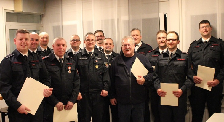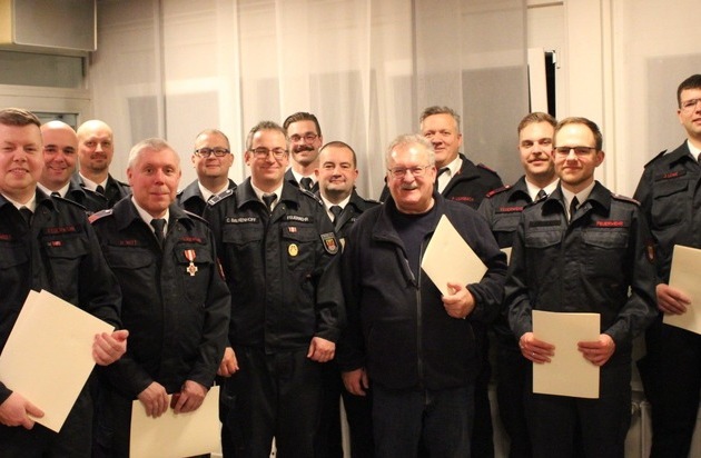 Am 16.01.2025 trafen sich die Ehrenabteilung, die Unterstützungseinheit und die Aktiven der Löschgruppe Drüpplingsen sowie der Spielmannszug im Dorfgemeinschaftshaus zur Jahresdienstbesprechung. Zu Gast waren der stellv. Leiter der Feuerwehr (Christopher Rosenbaum), der Sprecher der Freiwilligen Feuerwehr (Peter Korte), die Löschzugführung Nord (Matthias Söhnel u. Christian Loos). Die Löschgruppe freute sich im Jahr 2025 über ein neues Mitglied in der aktiven Einheit sowie ein Mitglied in der Unterstützungseinheit und kommt so auf 32 aktive Einsatzkräfte und 16 Mitglieder in der Unterstützungseinheit. Insgesamt zählt die Löschgruppe zum Jahresende 61 Kameradinnen und Kameraden, die sich ehrenamtlich engagieren. Die Löschgruppe hatte im letzten Jahr mit rund 45 Übungsdiensten, 24 Veranstaltungen, 8 Seminaren und Fortbildungsveranstaltungen viel Programm. Dazu kamen 26 Einsätze, darunter waren unwetterbedingte Einsätze, Kaminbrände, Waldbrände, Verkehrsunfälle, ein Industriebrand in Sümmern sowie der Einsatz zur Bergung einer Person aus der Ruhr. Auch die Ehrenabteilung konnte im Jahr 2025 wieder diverse Termine gemeinsam wahrnehmen und mit Rat und Tat auf Veranstaltungen und bei Übungsdiensten mit Fachwissen und Erfahrung unterstützen. Neben einer Überstellung in die Ehrenabteilung gab es auch einige Beförderungen und Ehrungen. Calum McGoldrick wurde zum Feuerwehrmann, Jan Lewe zum Oberbrandmeister, Marcel Karnath zum Oberfeuerwehrmann und Florian Balkenhoff zum Brandinspektor befördert. Alexander Kons konnte das Feuerwehr-Ehrenabzeichen des Landes Nordrhein-Westfalen in silber für 25-jährige Mitgliedschaft in der Feuerwehr und Peter Leimbach sowie Holger Witt das Feuerwehr-Ehrenzeichen in Gold für 35-jährige Mitgliedschaft in der Feuerwehr verliehen werden. Christian Balkenhoff wurde nach erfolgter Anhörung im Dezember für weitere sechs Jahre zum Löschgruppenführer der Löschgruppe Drüpplingsen bestellt. Weiterhin gab es einen Wechsel in der Löschzugführung Nord der Freiwilligen Feuerwehr. Matthies Söhnel gab sein Amt an Christian Loos weiter. Zudem wurde Florian Balkenhoff zum neuen stellv. Zugführer des Löschzuges Nord der Freiwilligen Feuerwehr Iserlohn bestellt. In 2026 freut sich die Löschgruppe bereits auf einige geplante Termine, wobei zwei Veranstaltung besondere Aufmerksamkeit verdienen, wie das traditionelle Himmelfahrtsbiwak auf dem Dorfplatz in Düpplingsen und dem Kreisleitungsnachweis der Feuerwehren im Märkischen Kreis, der in diesem Jahr in Iserlohn ausgerichtet wird.
