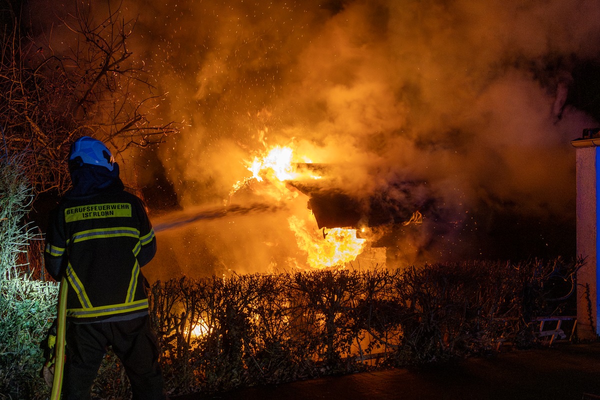 Mehrere Passanten meldeten am Mittwochabend gegen 22:30 Uhr eine brennende Gartenhütte an der Westfalenstraße. Bei Eintreffen des erstalarmierten Tanklöschfahrzeuges der Berufsfeuerwehr stand die Gartenhütte bereits in Vollbrand und drohte auf umliegende Vegetation überzugreifen, weshalb der restliche Löschzug der Berufsfeuerwehr sowie die Löschgruppe Stadtmitte der Freiwilligen Feuerwehr nachalarmiert wurden.