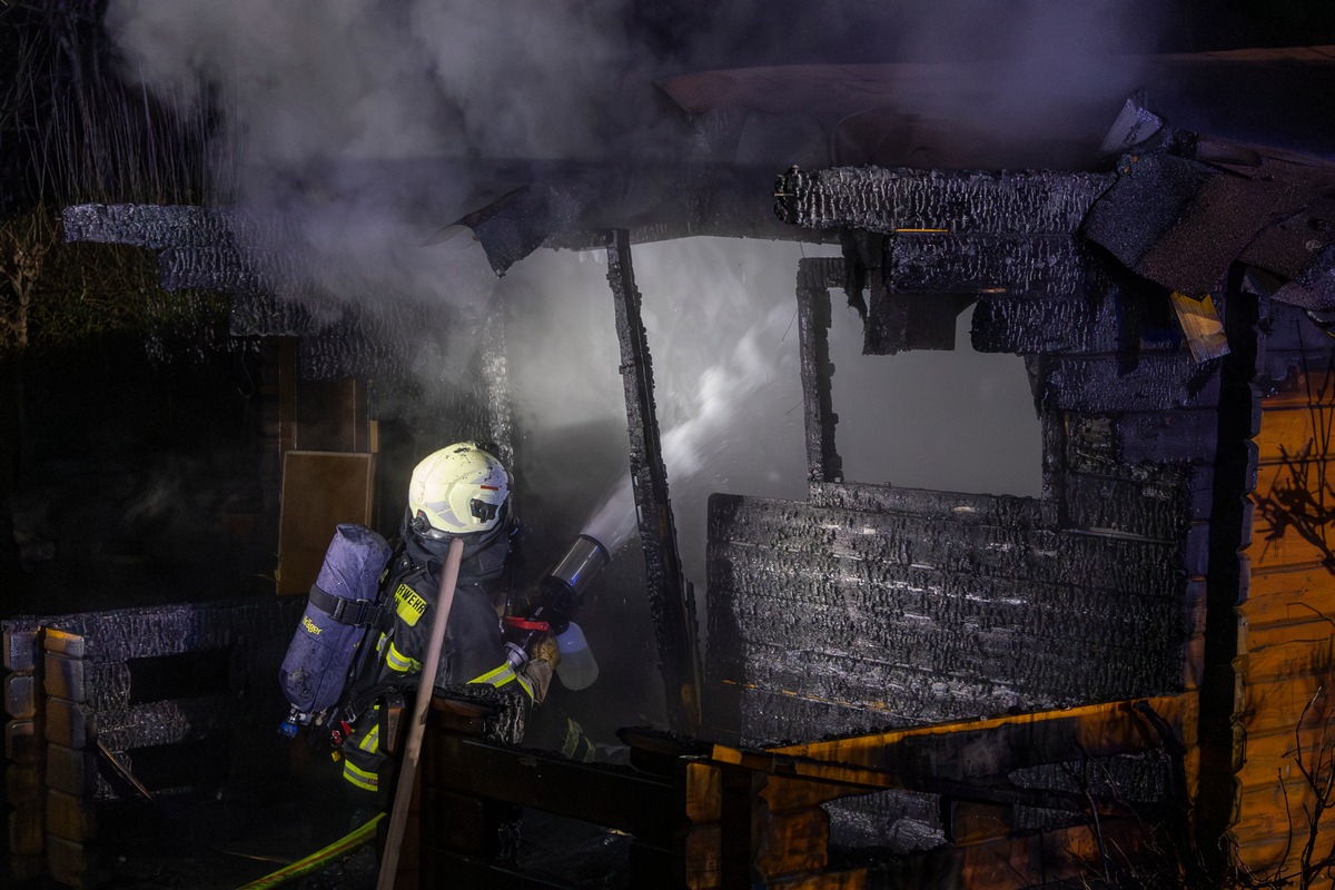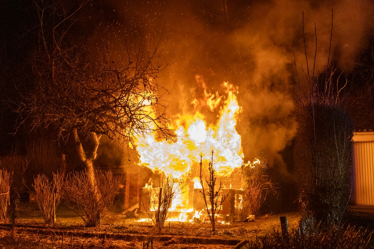 FW-MK: Brand einer Gartenhütte in voller Ausdehnung