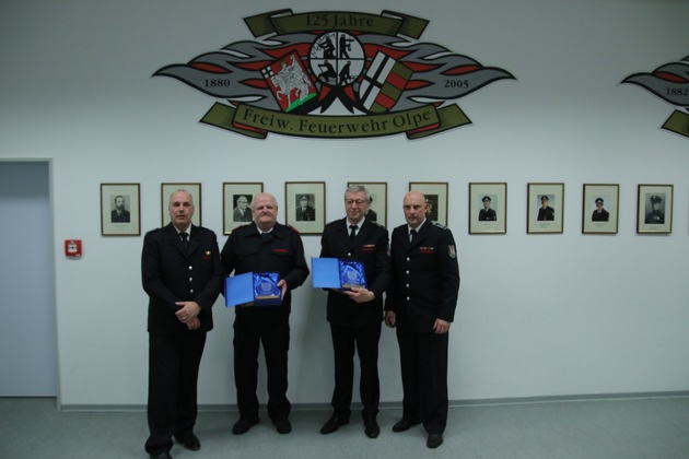 Abschließend warf ein weiteres besonderes Ereignis bereits seine Schatten voraus. So legt der stellvertretende Leiter der Feuerwehr Olpe Dirk Meiworm sein Amt zum 31.01.2026 nieder. Der Leiter der Feuerwehr Christian Hengstebeck würdigte und bedankte sich für seine jahrelange herausragende Arbeit. Zum 1.02.2026 treten Florian Schröder und Matthias Springmann die Nachfolge als stellvertretende Leiter der Feuerwehr an.