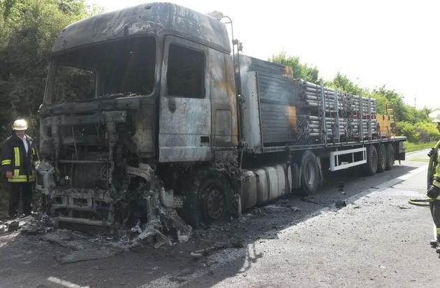 Ein Sattelzug ist heute auf der Autobahn 46 zwischen den Anschlussstellen Haan-West und Haan-Ost in Fahrtrichtung Wuppertal in Brand geraten. Dabei brannten die Zugmaschine und Teile des mit Holz beladenen Sattelaufliegers aus.