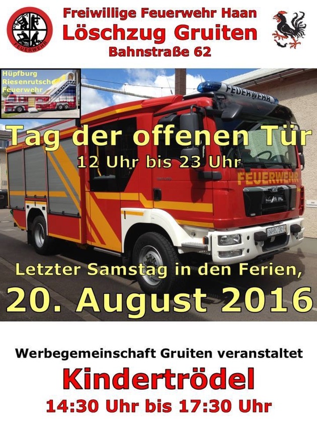 Zum Tag der offenen Tür lädt der Löschzug Gruiten der Freiwilligen Feuerwehr Haan am Samstag, 20. August, ans und ins Gerätehaus an der Bahnstraße 62 ein. Beginn ist um 12 Uhr.