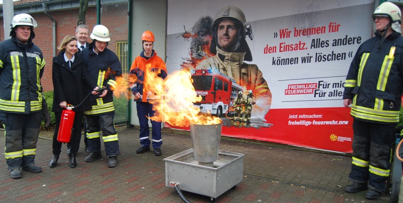 "Für mich, für alle" ist daher nur folgerichtig der Slogan, mit dem das Land und der Verband der Feuerwehren jetzt für die Arbeit der Einheiten werben. Über den Startschuss der Kampagne in Haan freut sich auch Bürgermeisterin Dr. Bettina Warnecke, die an einem der Großplakate die neue Feuerlöschübungsanlage testete, mit der die Feuerwehr Haan Brandschutzaufklärung in der Bevölkerung leistet. "Die Kampagne zeigt, wie vielfältig und spannend die Aufgaben in der Freiwilligen Feuerwehr heutzutage sind. Hier sind die unterschiedlichsten Talente gefragt. Jeder ist herzlich eingeladen, die tolle Gemeinschaft der Haaner Feuerwehr einmal unverbindlich kennenzulernen", sagte die Bürgermeisterin.