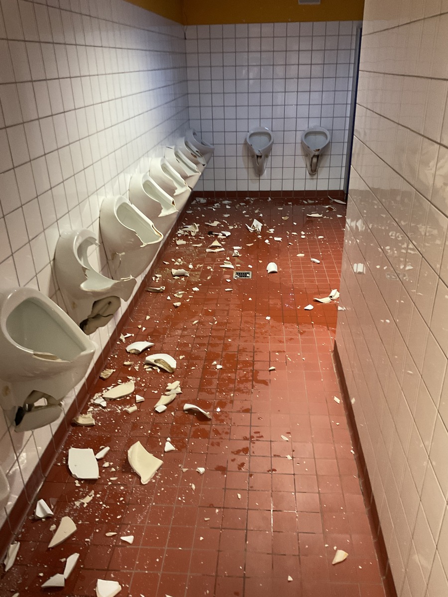 Insbesondere der Verwaltungsbereich der Schule ist in erheblichem Umfang betroffen. Die Toilettenanlagen wurden vollständig zerstört, wodurch sich Wasser auf der gesamten Etage, aber auch in die darunterliegenden Geschosse ausbreitete. Mobiliar und Türen wurden eingeschlagen. Auch in anderen Bereichen wie dem Schülercafé wurde mit massiver Gewalt vorgegangen, dort wurden ebenfalls Sanitärbereiche beschädigt.