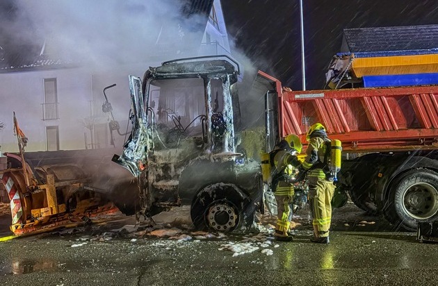 Beim Eintreffen der Einsatzkräfte bestätigte sich die gemeldete Lage: Der Lkw stand im Bereich des Fahrerhauses in Vollbrand. Bei dem Fahrzeug handelte es sich um ein Räum- und Streufahrzeug eines Privatunternehmens.