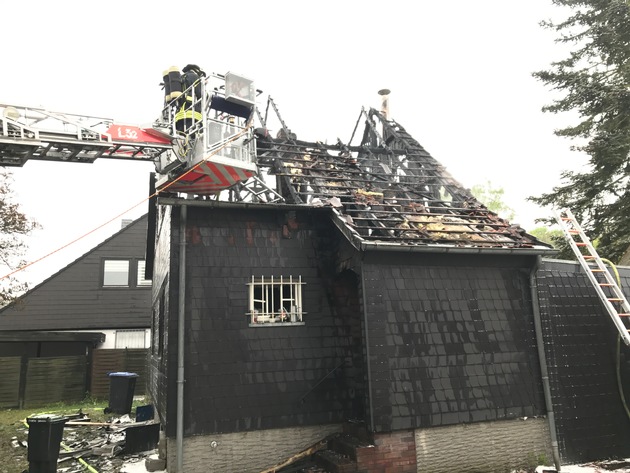Das Gebäude ist durch den Brand voll zerstört und unbewohnbar. Der Kreisbrandmeister des Rheinisch-Bergischen Kreises machte sich vor Ort ein Bild von der Lage.