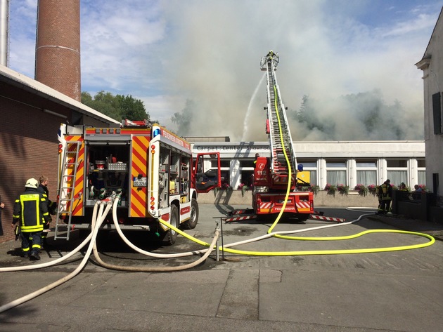 Hohe Außentemperaturen erforderten massiven Personaleinsatz Die Feuerwehr Dorsten wurde am heutigen Dienstag gegen 09:40 Uhr zu einem Brand einer Lagerhalle alarmiert, die der Lagerung von Teppichen und Messeständen diente. Noch während des Eintreffens der ersten Einsatzkräfte, kam es zu einer Durchzündung eines Teilbereiches des 180 x 60 m großen Komplexes. Da Menschen weder gefährdet noch verletzt wurden, konnten sich die eingesetzten Kräfte umgehend um den Schutz der übrigen Gebäudeteile und der angrenzenden Gebäude kümmern. Mit einem massiven Wassereinsatz über zwei Drehleitern mit Wenderohren und der Vornahme einiger C-Rohre, konnte ein Übergriff der Flammen erfolgreich verhindert werden. Da die physische Belastung der vorgehenden Frauen und Männer aufgrund der hohen Außentemperaturen extrem hoch war, wurde ein sehr hoher Kräfteansatz notwendig. Die Bekämpfung des eigentlichen Brandes gestaltete sich sehr schwierig, da das Feuer auf die Dachkonstruktion übergriff und ein öffnen des Daches notwendig machte. Die Brandbekämpfung in diesem Bereich wurde anschließend durch die geschaffene Öffnung möglich und so konnte ein ablöschen der Glutnester erfolgen.
