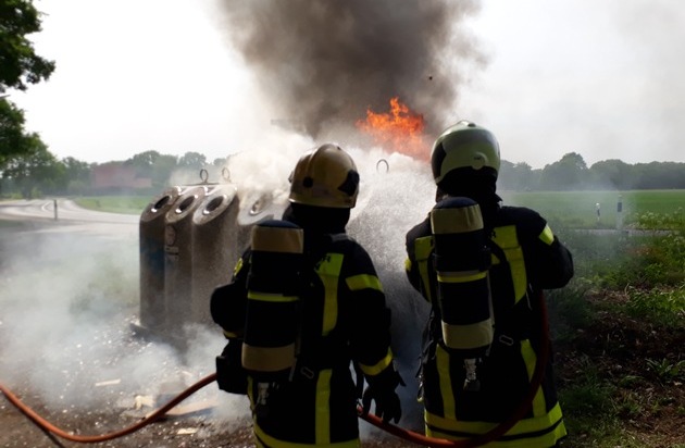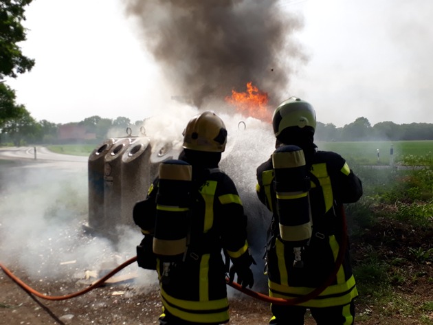 Am gestrigen Samstagnachmittag wurde die Feuerwehr Dorsten um 16:08 Uhr zum Söltener Landweg alarmiert. Im Bereich Birkenallee stand ein Altglascontainer in Vollbrand. Durch das Hilfeleistungslöschfahrzeug der hauptamtlichen Wache konnte der Brand mit der Schnellangriffseinrichtung unter Hinzugabe von Löschschaum gelöscht werden. Am späten Samstagabend um 22:37 Uhr wurde die hauptamtliche Wache zusammen mit dem Löschzug Altendorf-Ulfkotte zur Altendorfer Straße alarmiert. Im Bereich der Bundesautobahn 52 brannten ca. 80-100 m² Waldboden und Unterholz. Dieser Brand musste gleich von zwei Hilfeleistungslösch- und einem Tanklöschfahrzeug mit drei Schnellangriffseinrichtungen gelöscht werden. Ein drohender ausgedehnter Waldbrand konnte durch den massiven Wassereinsatz und unter Hinzugabe von Löschschaum verhindert werden.