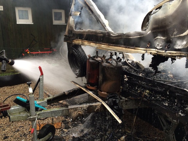 Die Feuerwehr Erkrath wurde heute um 16:10 Uhr durch die Kreisleitstelle Mettmann mit dem Einsatzstichwort "Gehöft" zum Gödinghover Weg 19 alarmiert. Der Anrufer konnte der Leitstelle mitteilen, dass auf dem Gehöft, neben der Lagerhalle für Kaminholz, ein Wohnwagen in voller Ausdehnung brennen und die Flammen bereits das Gebäude bedrohen würden. Aufgrund der geschilderten Lage wurde durch den Leitstellendisponent sofort Vollalarm für die gesamte Freiwillige Feuerwehr Erkrath ausgelöst.