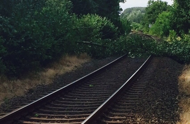 Ein umgestürzter Baum in Höhe des Bahnübergangs Hauer Straße sorgte gegen 17:30 Uhr auf der Bahnstrecke des RE 10 zwischen Goch und Kleve zu einer Streckensperrung. Kurzzeitige Sturmböen am frühen Abend waren der Auslöser.